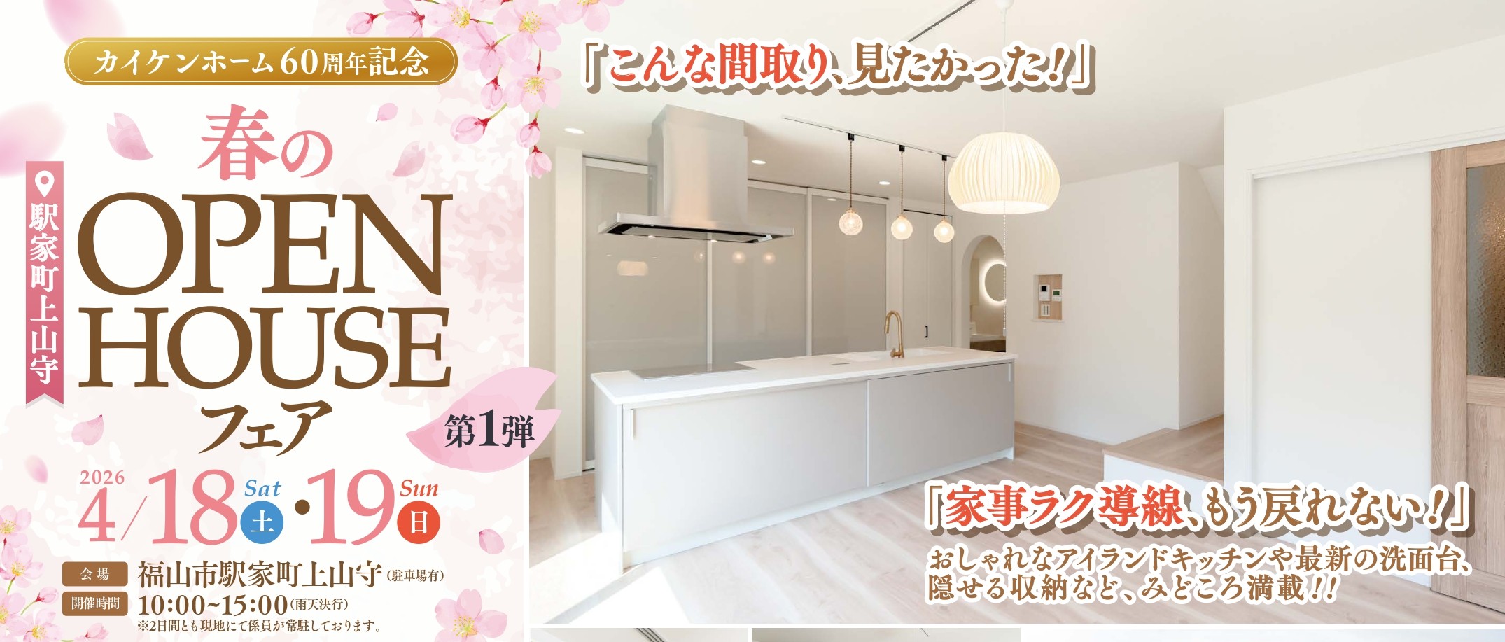 <終了>平屋住宅完成見学会in能島 2024-11-08 一級建築士設計の平屋住宅 カイケンホームによる平屋住宅の完成見学会を11月16日(土)・17日(日)に開催いたします! 静かな住宅街に佇む平屋は、悠々自適なライフスタイルを追求した、快適で暮らしやすいお家です。 見どころポイント 古き良き時代の民家を想起させる佇まい 自然光を取り入れる採光設計 いつも明るい光が差し込む設計で、一日中快適に過ごせるお家です。 平屋ならではの生活動線 ワンフロアで効率的な動線を実現。新次元の快適さを提供する工夫が詰まっています。 大型収納と整理された生活空間 寝室直結のウォークインクローゼット(WIC)をはじめとする豊富な収納で、すっきりとした空間を保てます。 四季を楽しむ大開口の窓と趣のある土間 四季折々の風景を楽しめる大開口の窓。窓を開放すれば土間を通じて外と一体感が味わえます。 LDKと土間の間に設けた障子がプライバシーを守り、静かなひとときを楽しめます。 当日は、この平屋を実際に手がけた建築設計士がご説明いたします。 見学会当日は、この平屋を設計した建築設計士が直接ご案内し、家づくりに込めたこだわりやデザインの意図を詳しくご説明いたします。採光や風通し、生活動線、収納の配置など、細部に至るまで施された工夫についても丁寧にご紹介いたします。設計士に直接質問していただける貴重な機会ですので、平屋住宅ならではの魅力や日々の暮らしをより快適にするアイデアをぜひ実際にお確かめください。 WEB来場予約で6,000円分の特典 事前にWEBからご予約いただくと、イベント来場者には感謝の印としてギフトカード6,000円分をプレゼントします。簡単なWEB予約で、家づくりの第一歩を踏み出しましょう。 開催期間 11月16日(土)・17日(日) 開催時間 10:00~16:00 場所 広島県福山市能島 ※詳細場所はご予約確定後にお伝えいたします 来場特典進呈の条件 ・お家づくりを真剣にご検討されている方 ・20歳以上の方 ・半年以内に弊社施工可能エリアにて、新築の建築をご検討されている方 ・予約フォームからご予約いただいた方 ・2日前までにご予約いただいた方 ・ほかのキャンペーンは対象外となります ・他社で請負契約済みの方は対象外となります。 希望日時【必須】 時間: ---10:0011:0012:0013:0014:0015:0016:0017:00 ・当日のご来場、及び夜間における翌日のご来場については、WEB上では予約受付をしておりません。当日にご来場される場合は、お電話でのご予約をお願い致します。 ・イベントのご予約状況により、ご希望に添えない場合がございます。 ご来場日時の変更につきまして、担当者よりご連絡させて頂きますので、ご了承下さい。 お名前【必須】 電話番号【必須】 メールアドレス【必須】 ご住所【必須】 Japan 〒郵便番号検索 都道府県 ---北海道青森県岩手県宮城県秋田県山形県福島県茨城県栃木県群馬県埼玉県千葉県東京都神奈川県新潟県富山県石川県福井県山梨県長野県岐阜県静岡県愛知県三重県滋賀県京都府大阪府兵庫県奈良県和歌山県鳥取県島根県岡山県広島県山口県徳島県香川県愛媛県高知県福岡県佐賀県長崎県熊本県大分県宮崎県鹿児島県沖縄県 市区町村 今回イベント予約をするきっかけになった媒体を1つ教えてください【必須】 ポストに届いたチラシご紹介新聞折込自宅近くの現場WEB広告(バナーなど)道路看板を見てDMハガキSUUMO WEBFacebookSUUMOカウンターInstagramその他 ご質問・ご相談等ご記入ください。 個人情報について【必須】 個人情報の取り扱いに同意する個人情報の取り扱いに同意する ・データを送信される際の情報はSSL暗号化通信により保護されますので安心してご利用ください。 【携帯メールアドレスのドメイン指定受信に関するお願い】 メールアドレスを登録された方には、自動で確認メールを送信しております。メールアドレスの誤入力、携帯電話のドメイン指定受信の設定などにより確認メールを受信出来ない場合がございます。迷惑メールなどに入っている場合もございますので、再度受信設定をご確認ください。確認メールが届かない場合は、当社からの返信を受信出来ない可能性がございますので、お手数ですが、メール以外の連絡方法を追記の上、再度お問い合わせいただきますようお願い致します。 〈重要〉 yahooメール、Gmail、携帯電話のキャリアなどのメールアドレスはセキュリティ性能が向上しており、弊社からの連絡メールが受信できない場合がございます。ご返信が届かない場合にはお手数ですが直接お電話のご連絡をお願いいたします。 Δ
